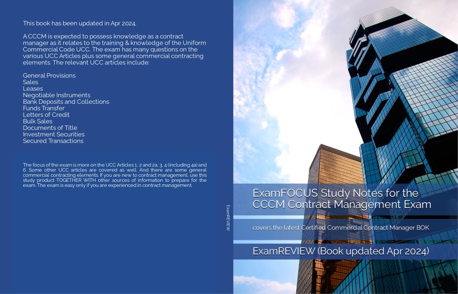 The focus of the exam is more on the UCC Articles 1, 2 and 2a, 3, 4 (including 4a) and 6. Some other UCC articles are covered as well. And there are some general commercial contracting elements. If you are new to contract management, use this study guide TOGETHER WITH other sources of information to prepare for the exam. The exam is easy only if you are experienced in contract management. If you are not, then lots of readings would have to be done. In this study product we have both contracting-specific and business knowledge sections. We label those business knowledge sections as “General Business Knowledge” sections. These sections have information that is not on the technical aspect of contracting but is still relevant for day-to-day contract admin works.