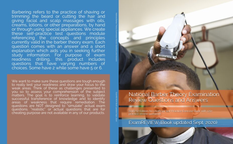 Barbering refers to the practice of shaving or trimming the beard or cutting the hair and giving facial and scalp massages with oils, creams, lotions, or other preparations, by hand or through using special appliances. We create these self-practice test questions module referencing the concepts and principles currently valid in the barber theory exam. Each question comes with an answer and a short explanation which aids you in seeking further study information. For purpose of exam readiness drilling, this product includes questions that have varying numbers of choices. Some have 2 while some have 5 or 6. We want to make sure these questions are tough enough to really test your readiness and draw your focus to the weak areas.
