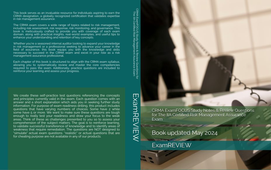 Whether you’re a seasoned internal auditor looking to expand your knowledge in risk management or a professional seeking to advance your career in the field of assurance, this book equips you with the knowledge and skills necessary to succeed in the CRMA exam and excel in your role as a risk management assurance professional.